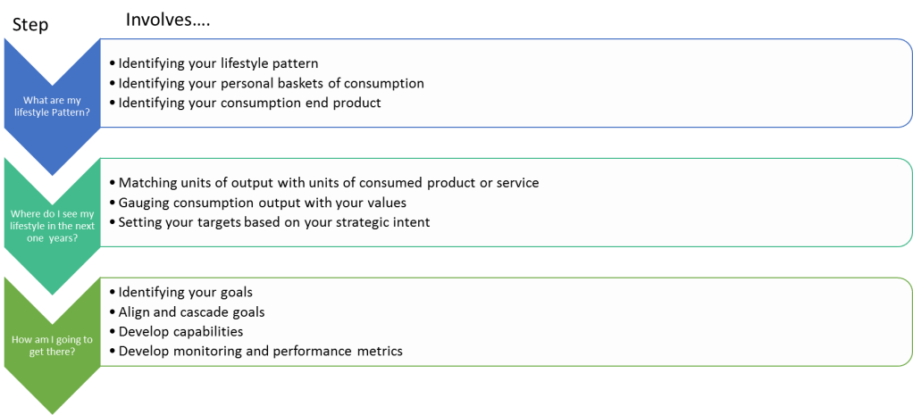 The third aspect of personal lifestyle visioning is identifying different baskets of your consumption end product. Each output unit should be matched with units of consumed product or service. Then gauge units of consumption output with your values. At the end of this leg, set your targets based on your strategic intent, which reflects your short-term and long-term emission reduction, conservation efforts and contribution to a sustainable future for your generation.
